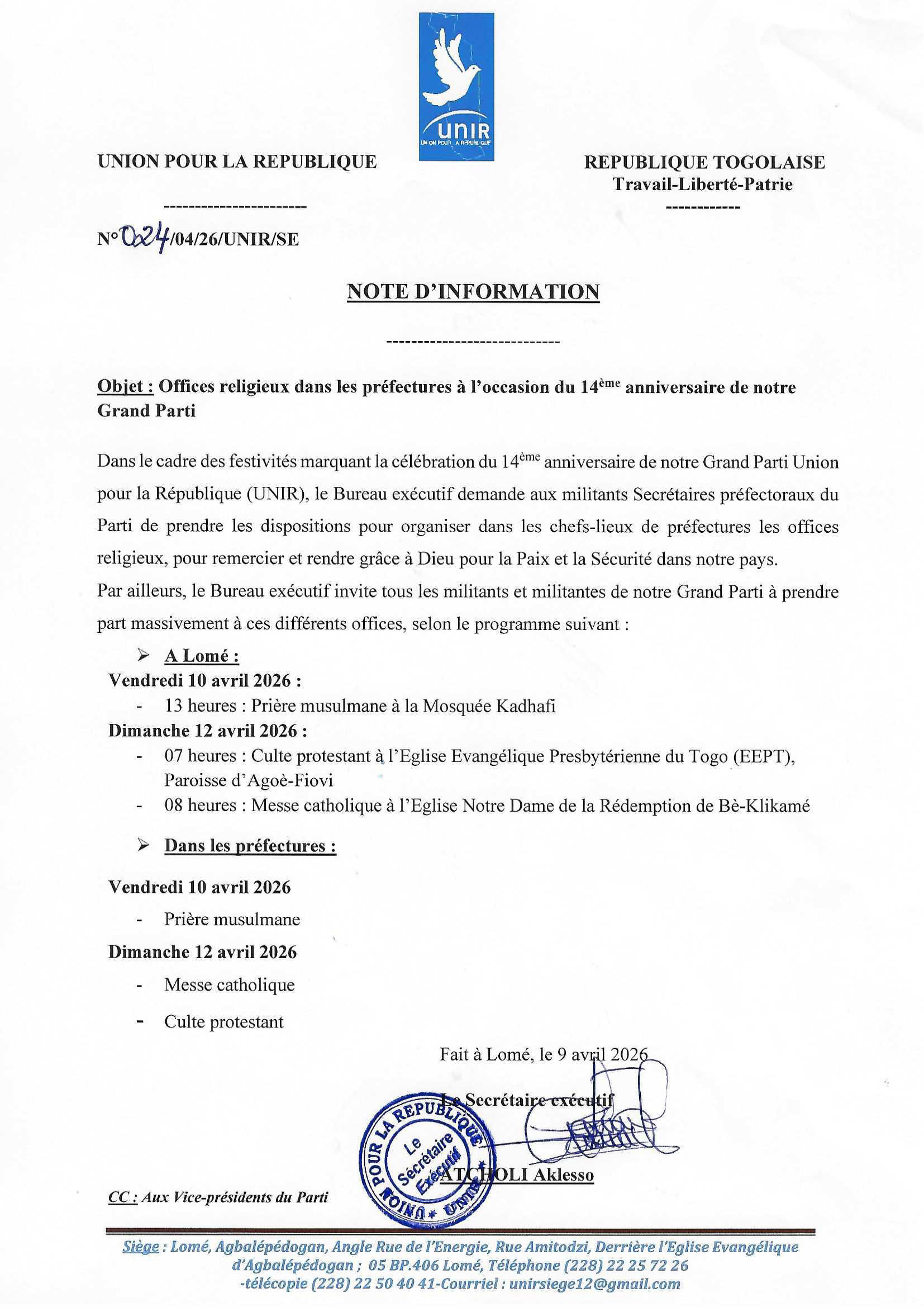 - 14ème Anniversaire du parti Unir : Note d’information aux Vice-présidents et Secrétaires préfectoraux